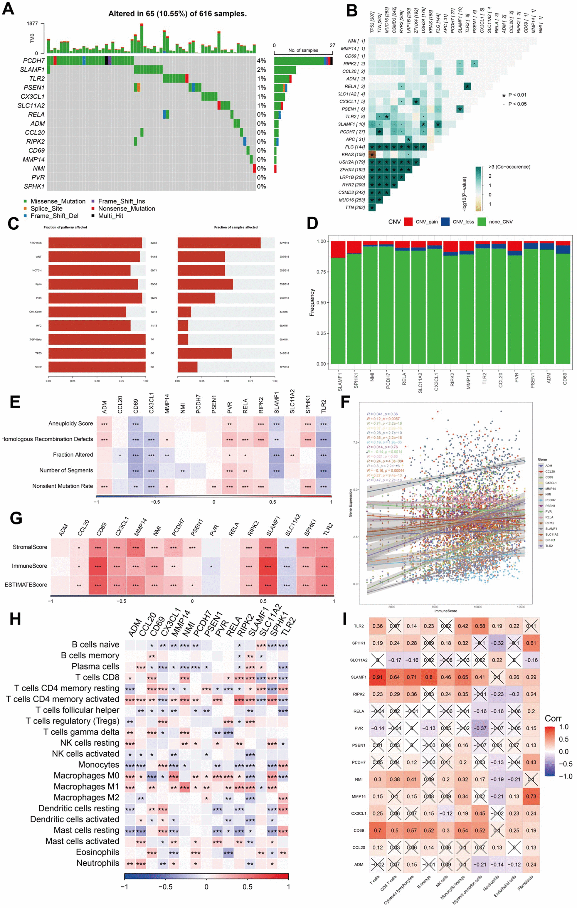 Figure 6.Analysis of mutation, immunity, and hub gene pathways. (A–E) The correlation between the mutation status and hub genes. (F–I) The features of immune cells and immune score based on the 15 hub genes. ***P <0.001, ****P < 0.0001.