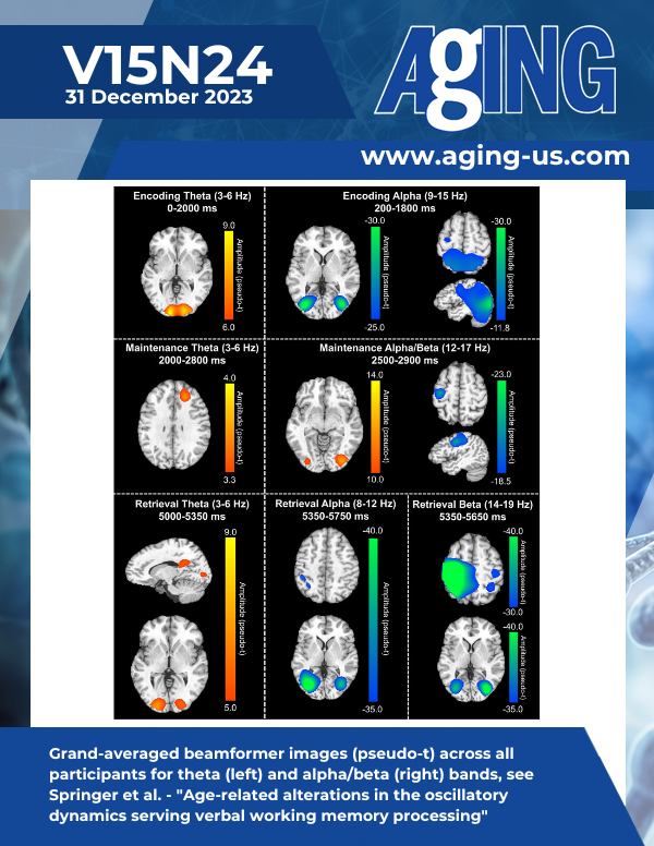 The cover features Figure 3 "Grand-averaged beamformer images (pseudo-t) across all participants for theta (left) and alpha/beta (right) bands" from Springer et al.
